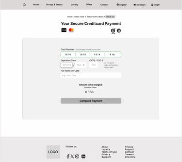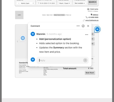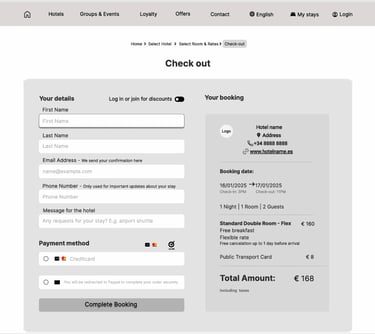 In Figma, I created a mid-fidelity prototype of the redesigned booking flow, simplifying search, pricing clarity, and checkout. The prototype follows the main ‘happy path’: booking a double room in Barcelona (16–17 January) with clear details on location, facilities, breakfast, and cancellation. Only the primary path is clickable.
